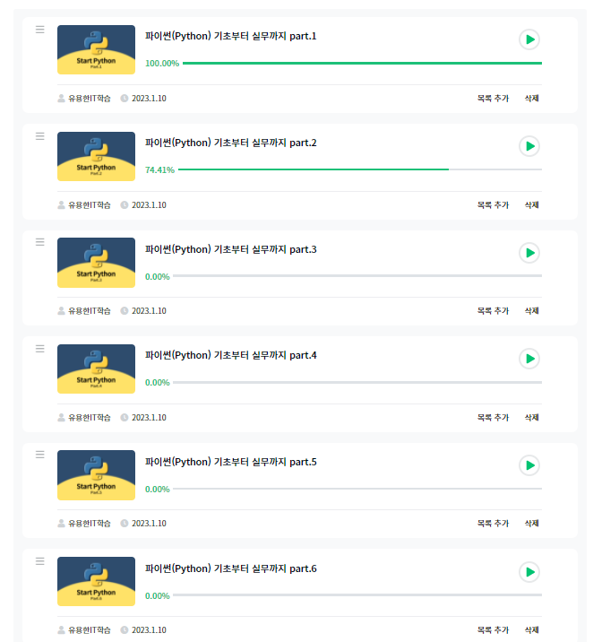 사실 3단계인 인프런 강의가 PART1~PART7까지 있고 각각 파트당 24~29시간이다보니 시간이 많이 걸릴 수 밖에없더라구요. 물론, 24시간 공부만 하시는 분 입장에서는 10일이면 들을 수 있다고 하지만, 저는 사실 뭐.. 국비지원을 받아서 IT와 관련된 직종을 들어가기 위해서 공부를 하겠다라는게 아닌, 나의 취미생활과 업무자동화를 위해서 배우는 것들이라
