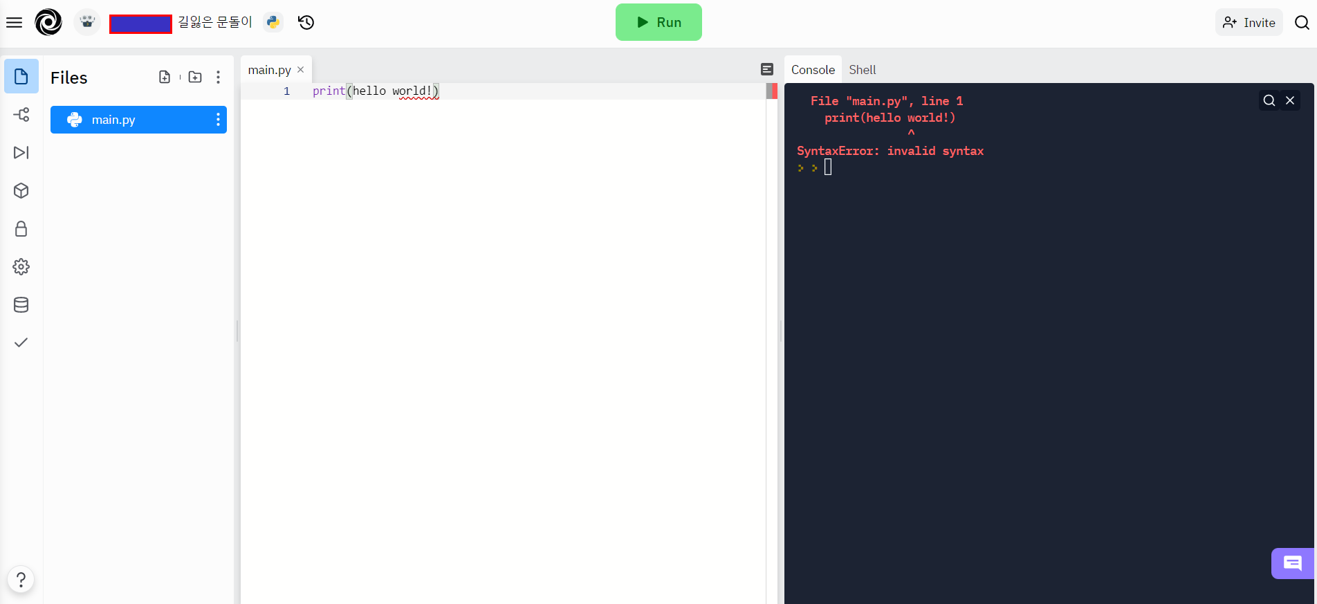 Replit의 좋은 점이라고 할 수 있는 부분은 우선 각 언어별로 코딩툴을 깔 필요가 없고, 언어를 배우기에는 적절하다고 생각해서입니다! 이뿐 아니라, 밑에 사진과 같이 RUN이라는 클릭 장치가 있어서 자기가 코딩했던 부분을 바로 옆에서 확인이 가능하다는 점에서 실시간 확인 가능함이 가장 큰장점이라고 할 수 있겠습니다!
